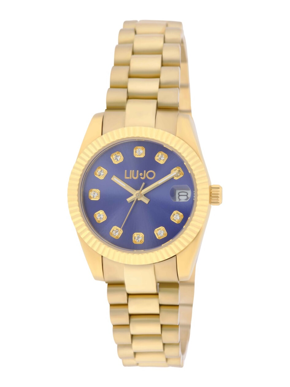 Cadran bleu avec aiguilles dorées contrastantes et index en pierre